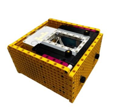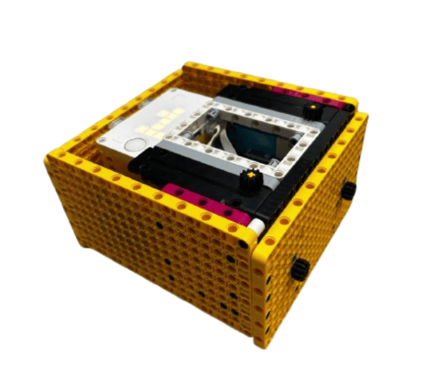 This is the attachment for the What's On Sale + Tip the Scales mission. To complete the mission, we used beams and an L-shaped piece to lift up the roof, and the axle connected to it tips the scale. Next, the sideways arm with the pin at the bottom puts down the market ware and latches onto the scale pan. The two angled yellow pieces help align with the mission for precision and accuracy.